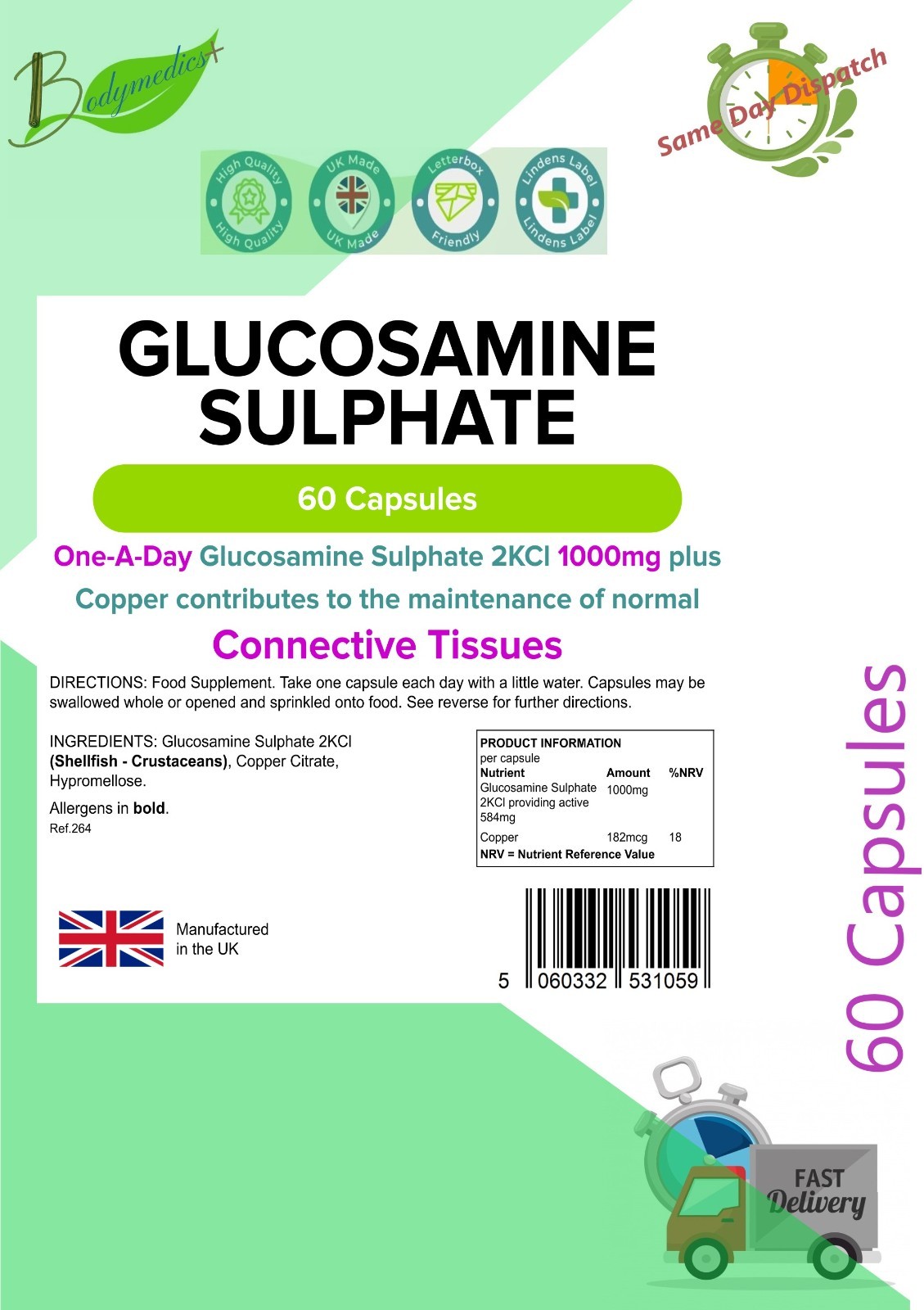 Glucosamine Sulphate 1000mg Joint Connective Tissue Health 60 Capsule LINDENS UK