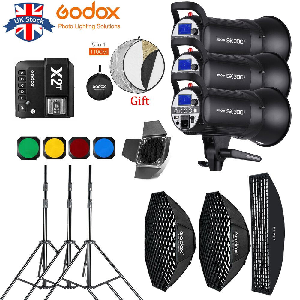 UK 3*Godox SK300II 300W 2.4G Flash+Grid bowens softbox light stands+X2T Trigger