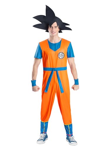 Smiffys Dragon Ball Z Goku Costume Adults, Official Licensed Anime Cosplay Outfit Orange Blue Jumpsuit, Wristbands, Spiky Black Goku Wig Headpiece, Men’s Saiyan Fancy Dress Halloween, Parties, Large