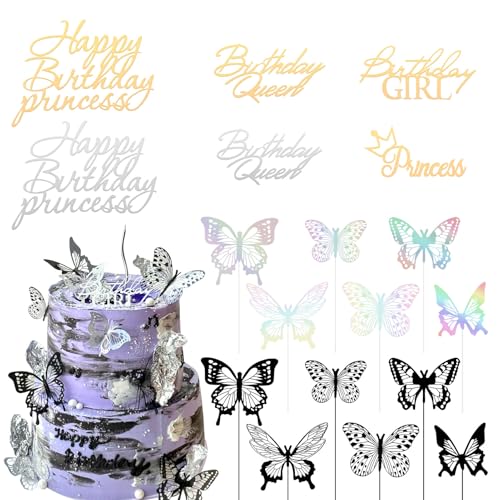 24 PCS Butterfly Cake Decorations with 6 PCS Happy Birthday Side Gold and Silver Mirror Acrylic Cake Toppers, Reusable Butterfly Party Cake Toppers, for Wedding, Birthday Party
