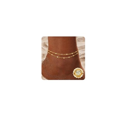 CASSIECA Silver/Gold Layered Ankle Bracelet for Women - 925 Sterling Silver Dainty Waterproof Beaded Rope Link Beach Foot Jewelry