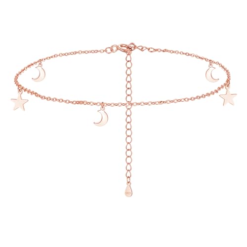 Estrellique 925 Sterling Silver Anklet for Women, Waterproof Barefoot Summer Beach Foot Ankle Jewelry for Girls, Rose Gold Adjustable 22+5CM Chain Anklet Bracelet, Women's Anklets with Small Star Moon