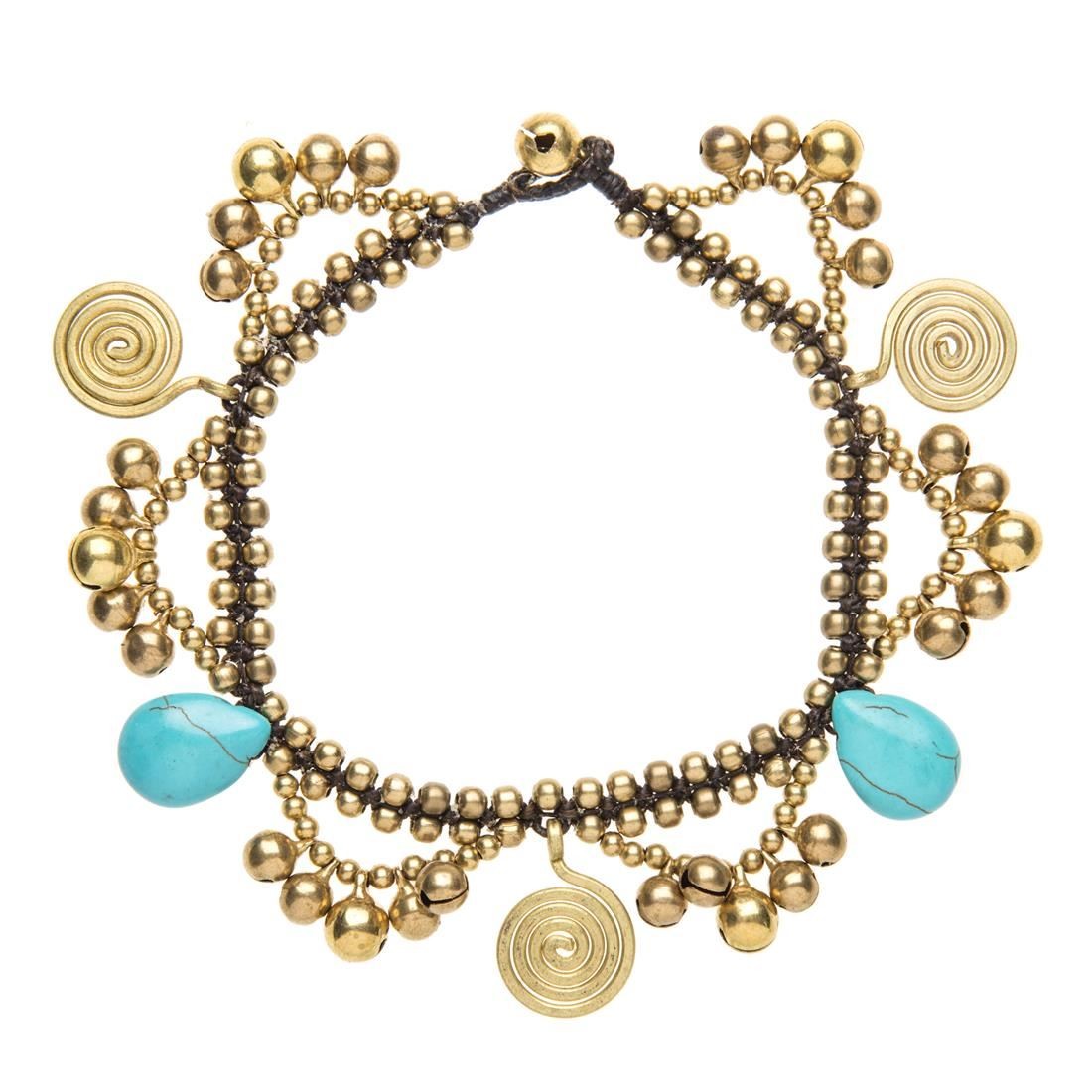 81stgeneration Ankle Bracelet Gold Brass Turquoise Spiral Bead Bell Anklet
