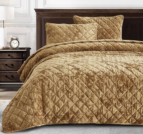 Grassix Velvet Quilt Set King Size - Luxury Cozy Velvet Quilt Bedding Set, Lightweight Velvet Comforter for All Season, Cross Stitch Coverlet Bedspreads with 2 Shams, Gold Caramel