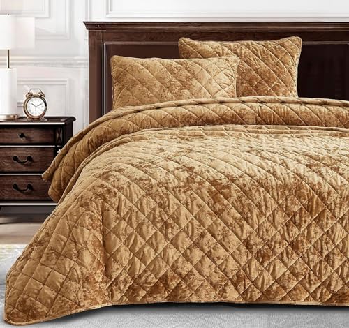 Chezmoi Collection Lux Caramel Gold Velvet Quilt Oversized King Set, 3-Piece Plush Distressed Velvet Bedding All Season Lightweight Comforter Brushed Microfiber Reverse with Diamond Stitch Quilting