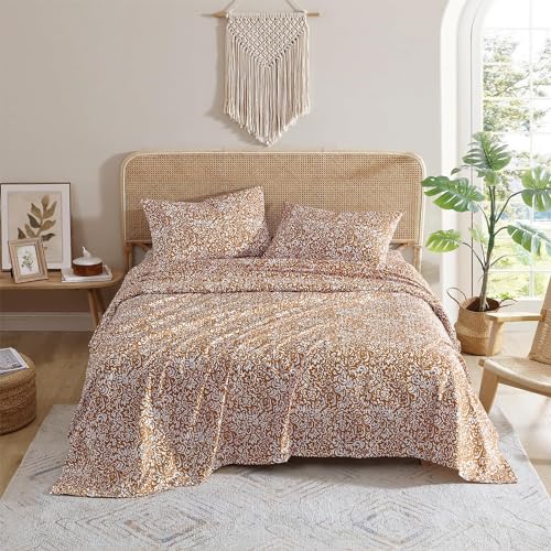 Indigo Ink - Queen Size Sheet Set, 4-Piece Boho Floral Damask Patterned Bedding, Soft & Wrinkle Resistant (Tufted Medallion Collection, Gold)