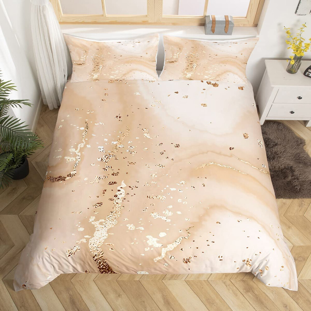 WONGS BEDDING - Shiny Metallic Gold and Khaki Marble Print Duvet Cover Set Queen Size, 2 Pillow Cases, Soft Microfiber Fill, 90" x 90"