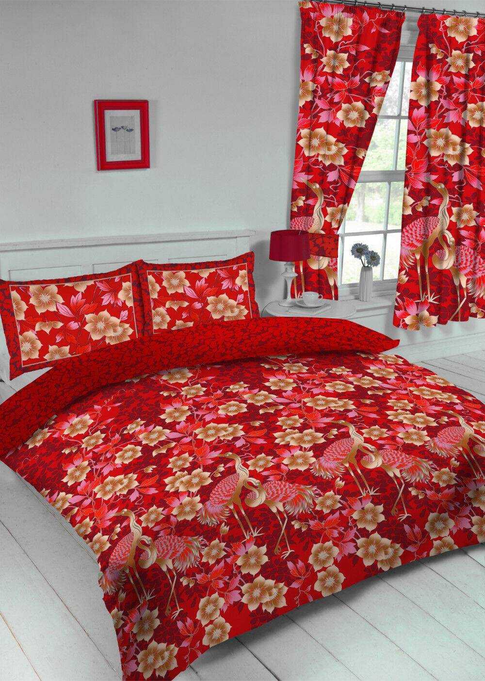 DOUBLE BED DUVET COVER SET HERON RED GOLD FLORAL REVERSIBLE BEDDING SET