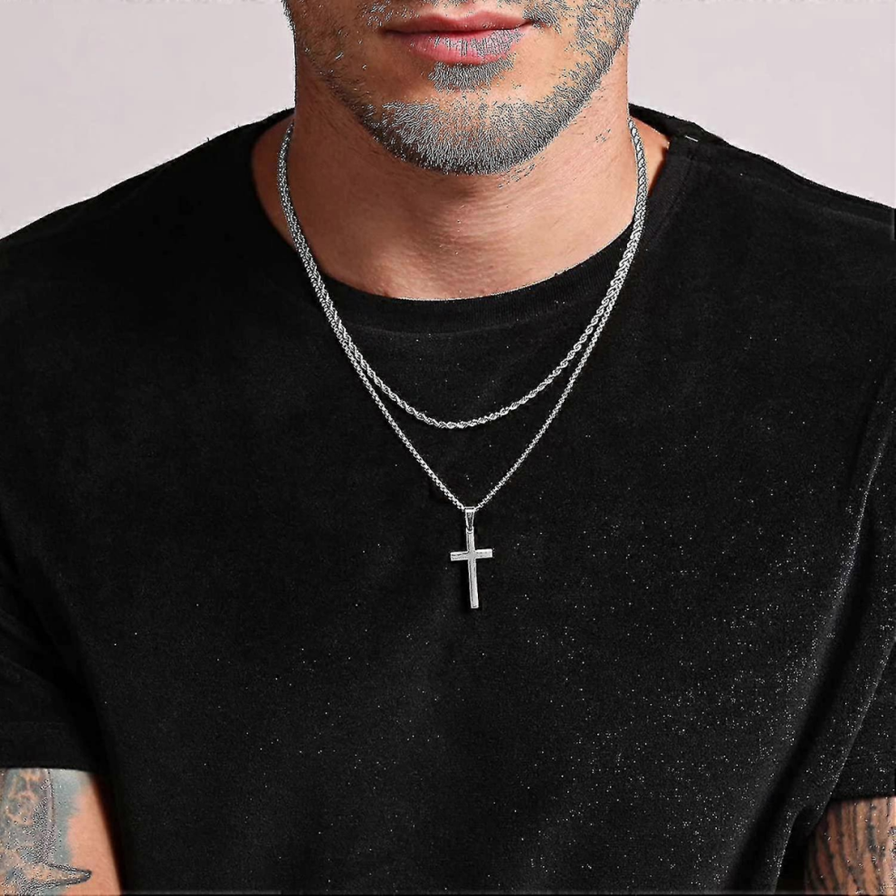 (Silver, One size) Cross Necklace Men Stainless Steel Silver Black Gold Layered Rope Chain Cross Pendant