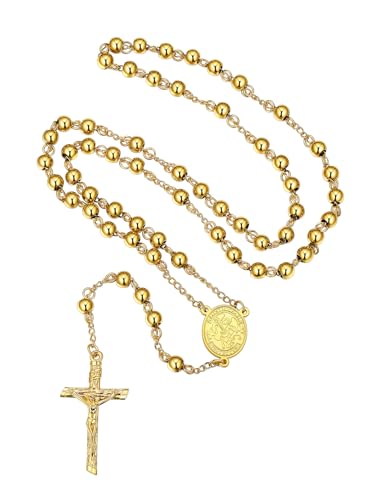 FaithHeart Archangel Michael Pendant Gold Rosemary Beads Rosary Chain Stainless Steel Crucifix Cross Jesus Necklace for Women Girls