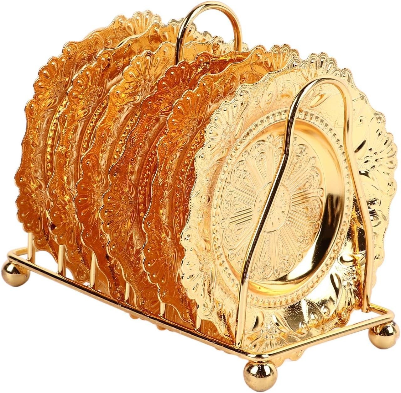 6 Gold Vintage Coasters Set with Holder Stand Round Metal Mats Plates