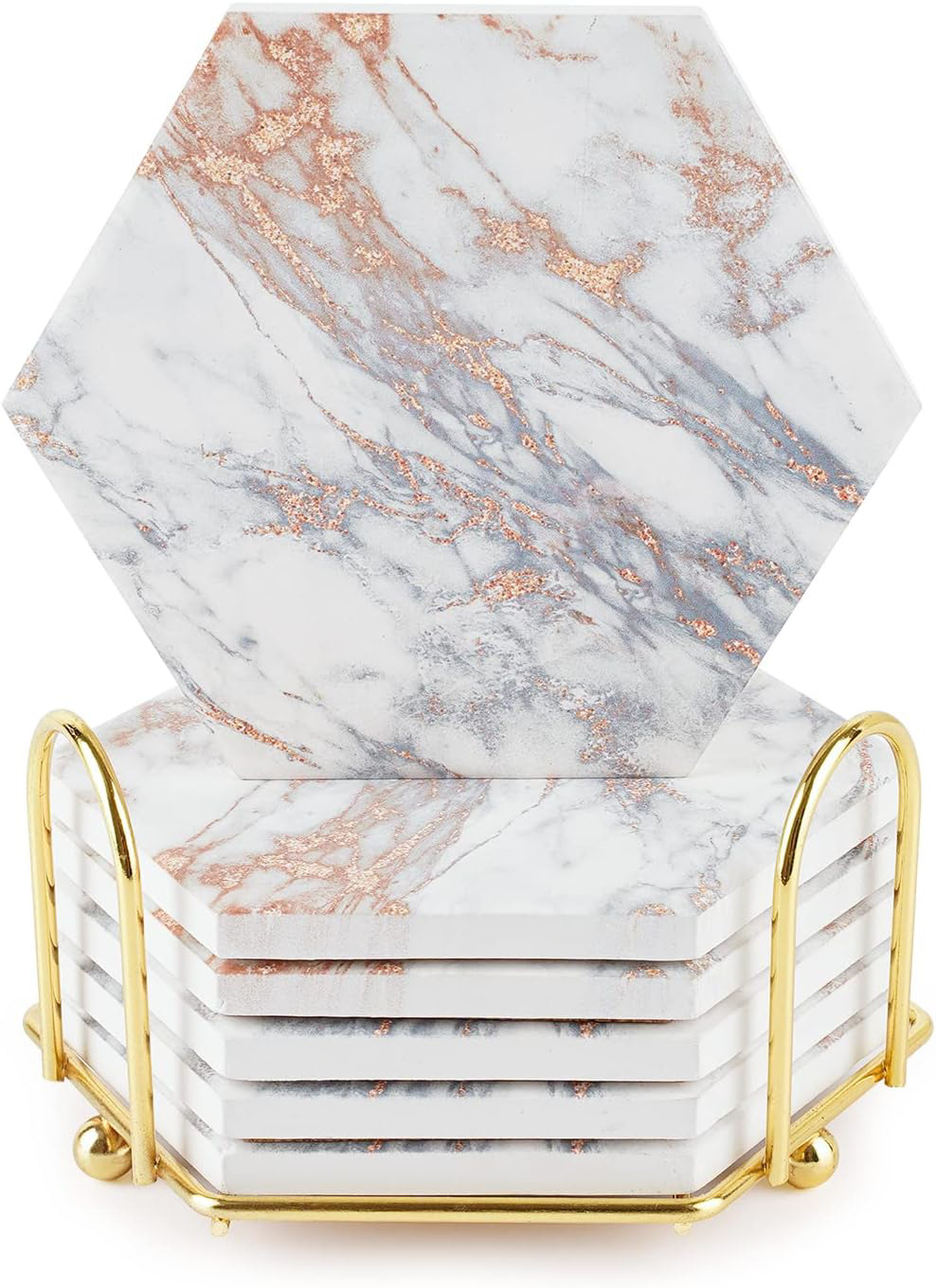 6 Pcs Pink Marble Coasters with Holder Gold Absorbent Drink Coasters Hexagon Ceramic Table Coaster Ser Decorative Bar Wine Coasters