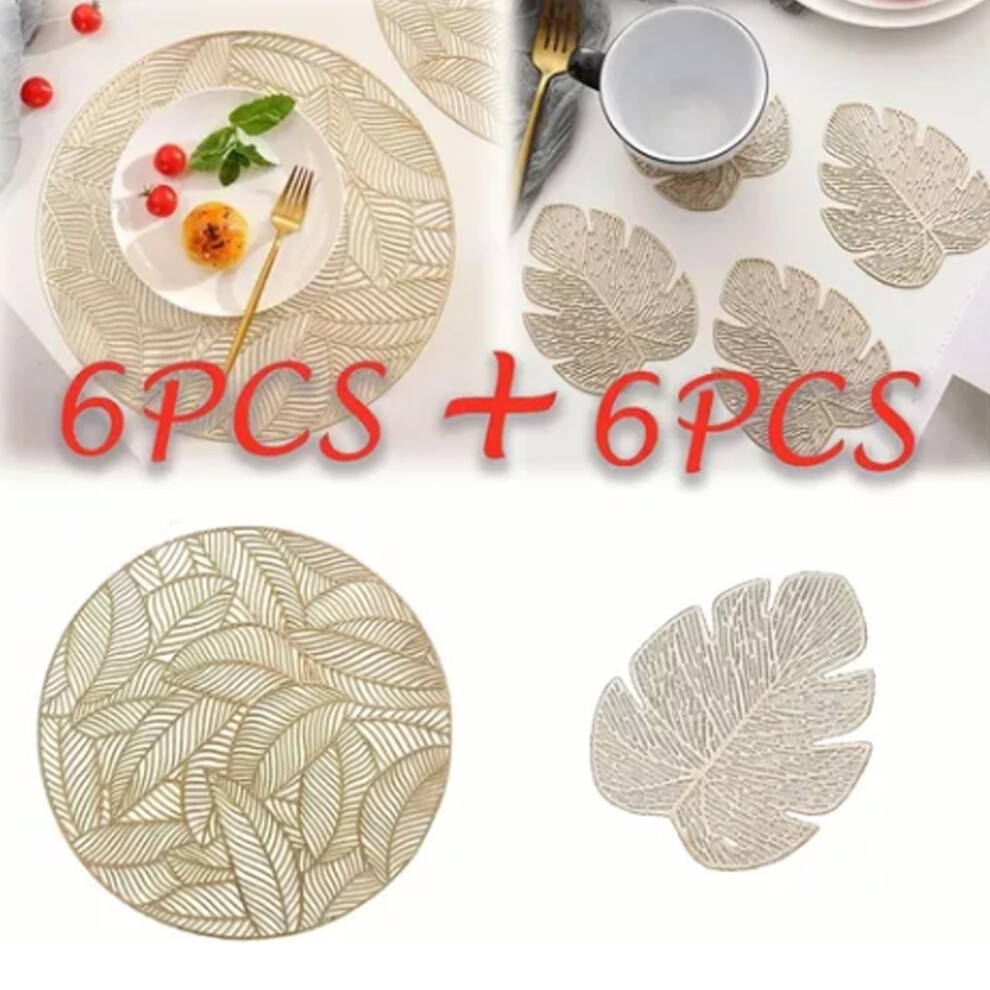 Placemats and Coasters Set Hollow Insulation 6 Pcs Round Dining Table Place Mats and 6 Pcs Leaf Shape Cup Coasters Gold
