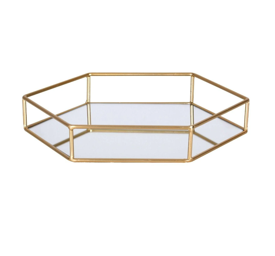 Hexagon Mirror Plate Jewellery Platter Metal Gold Frame Display Cosmetic Tray