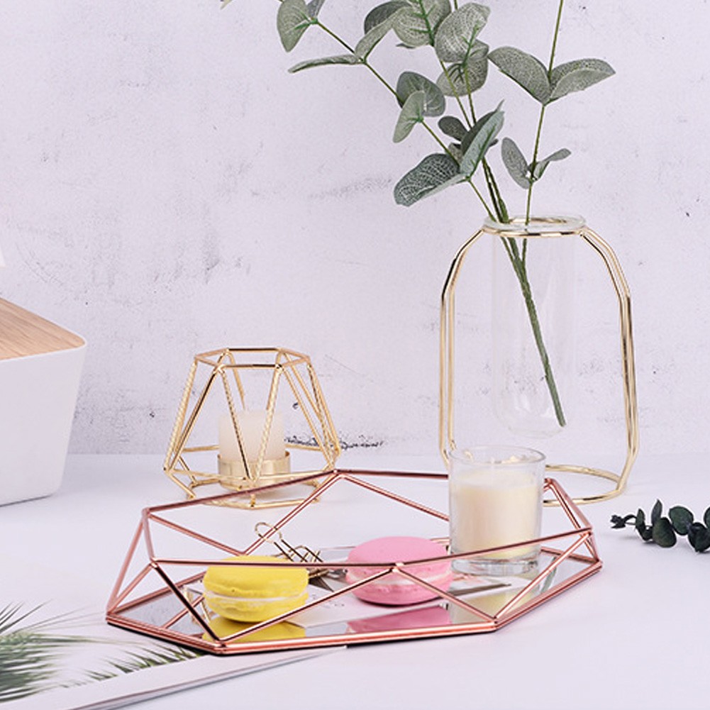 Bathroom Sexangle Mirror Metal Gold Cosmetic Jewelry Storage Tray BH