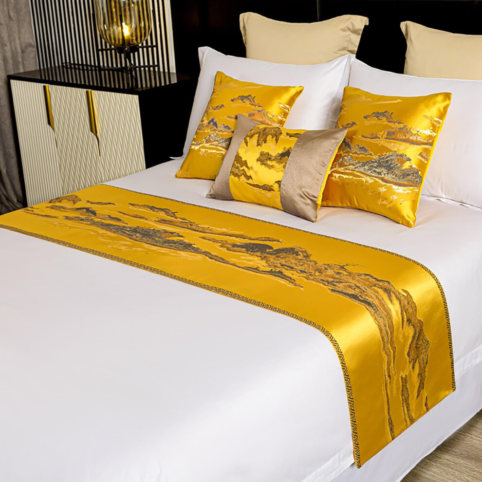 Bed Runner Rug King Size Silky Hotel End Scarf Soft Cushions Gold Includes 2 Pillowcases 45x45cm
