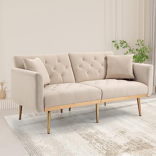 ModernLuxe 2-Seater Sofa Bed,Velvet Upholstered Sofa with Adjustable Backrest,Space-Saving Small Sofa Bed with Cushions,Gold-Plated Metal Feet, Ideal for Guest Room & Living Room,Beige