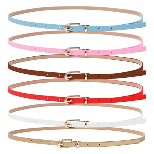 Keboyoe 6 Pcs Skinny Leather Belt for Women Thin Belts for Women Adjustable Slim Thin Waist Belt with Gold Buckle Skinny Belt for Jeans Dress Pants(6 Colours)