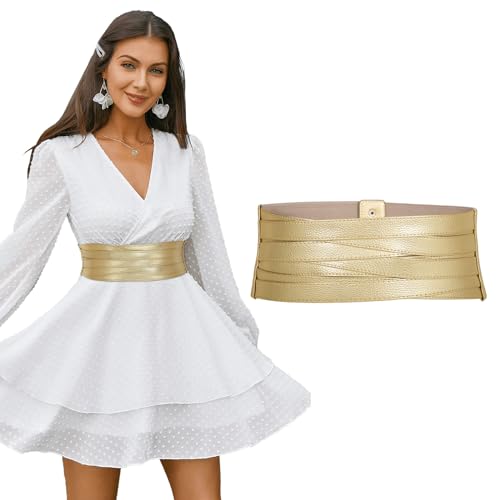 LEACOOLKEY Women Wide Leather Belt for Dress Chunky Elastic Stretchy Belt for Women Thick Obi Cinch Belt,Gold