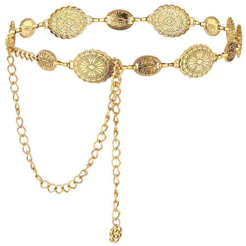 Gold Chain Belt,Waist Belts Metal Adjustable Womens Daisy Chains Women's Vintage Boho Belly Body Chunky Concho Jewellery Buckle Large Accessories,for Dress Jeans Western Cowgirl Women Cosplay Pirate