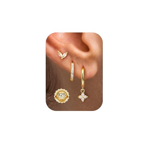 Morfetto Gold Hoops Earrings for Women - Small Sterling Silver Stud Earrings Huggies Dainty Hypoallergenic 14k Gold Plated Earring Stacks for Cartilage 3 Pair dangle