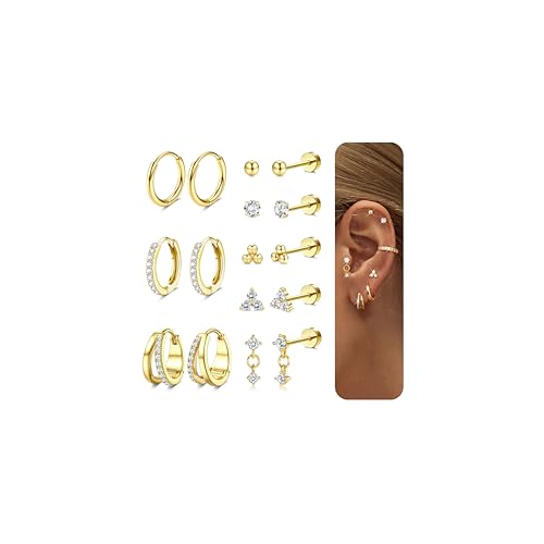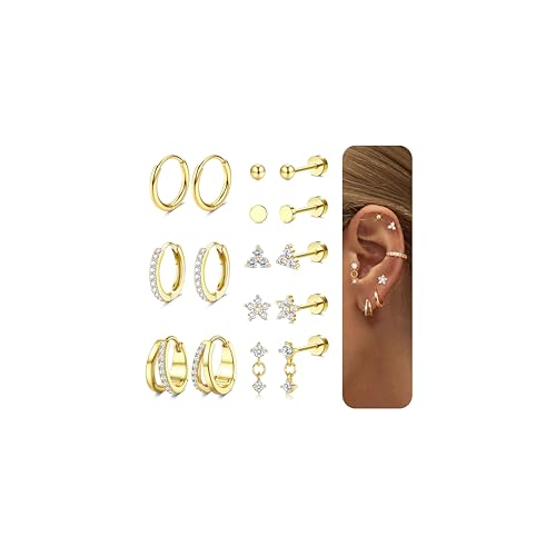 Diamday 12 Pairs Earrings for Women Surgical Steel Flat Back Earrings Hoop Earring Set 14K Gold Helix Tragus Cartilage Stud Earring Gold Huggies Hoops Studs Hypoallergenic for Multiple Piercings C