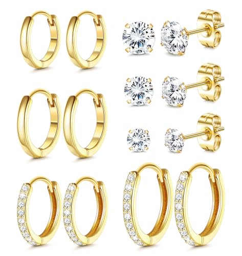 FIOROYAL 5Pairs Gold Hoops Earrings for Women Gril Men 14K Gold Plated Small Gold Silver Hoop Earrings Cubic Zirconia Cartilage Sleepers Huggie Hoop Earring 6/7/8/9/10mm G