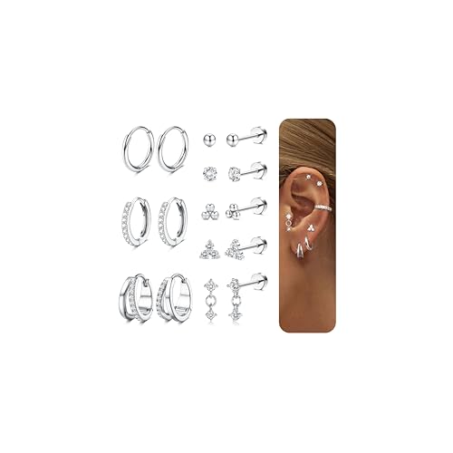 Diamday 8 Pairs Silver Earrings for Women Surgical Steel Flat Back Earrings Helix Tragus Piercing Jewellery Silver Hoops Earring Gold Studs Hypoallergenic Conch Helix Tragus Cartilage Earring Set B