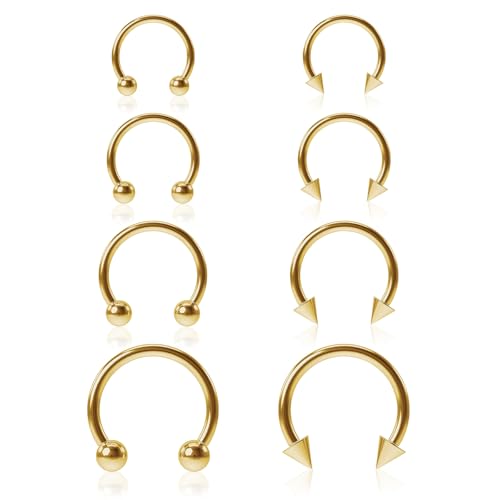 PT Haahoos 8 Pcs Gold Horseshoe Nose Ring, 16G Stainless Steel Septum Tragus Earring Lip Helix Belly Piercing Jewellery with Spike, 6mm 8mm 10mm 12mm Circular Bead Rings for Men Women (Gold)