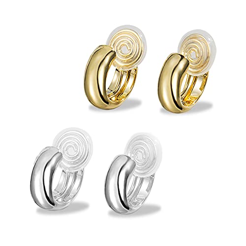 EQLEF Clip On Hoop Earring, 2 Pair Earrings Hoops Fake Earring for Girls and Women No pierced Earring Hoop Silver and Gold