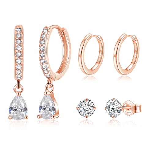 Loutade Silver Hoop Earrings for Women, 3 Pairs 925 Sterling Silver Hoop Earrings & Teardrop Dangle Hoop Earrings & Stud Earrings Set, Small Simple CZ Cartilage Sleeper Rose Gold Earrings for Girls