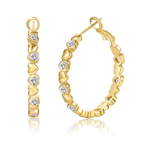 PABBEU Gold Hoops Earrings for Women Cubic Zirconia 14K Gold Plated Earrings Hypoallergenic Heart Hoop Earrings Lightweight Gold Hoop Earrings for Girls Women 30mm