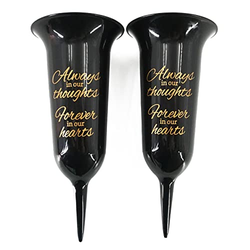 Set of 2 Black and Bronzed Gold Forever in Our Hearts Fluted Spiked Memorial Grave Flower Vases