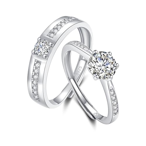 Kamise Silver Couple Rings for Women/Men, 2PCS 925 Sterling Silver Matching Wedding Anniversary Rings Set, Adjustable Zirconia Engagement Ring, White Gold Plated Forever Love Ring for Valentines Party