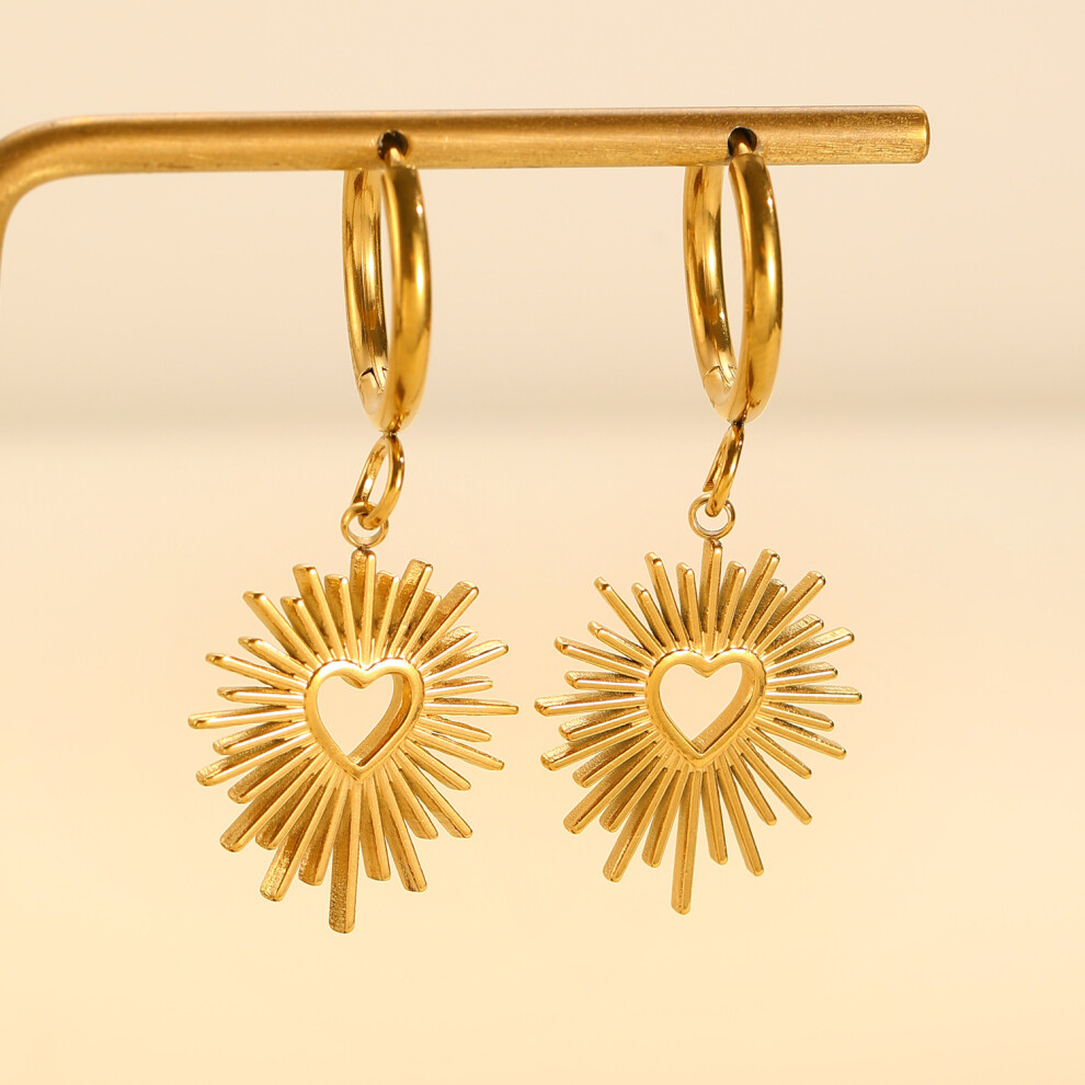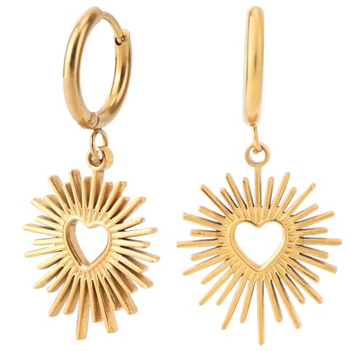 Mikovivi Gold Heart Dangle Hoop Earrings, Trendy Dainty Heart Sunburst Drop Earrings Stainless Steel Cute Statement Jewelry Gifts for Women