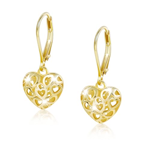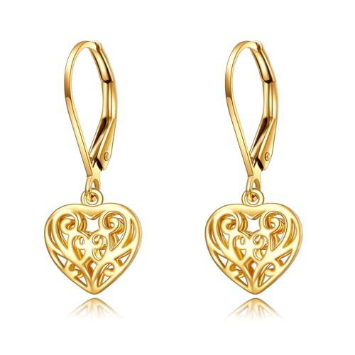 14k Gold Heart Dangle Earrings Yellow Gold Filigree Heart Drop Earrings Fine Gold Leverback Earrings Jewelry Christmas Gifts for Women Her