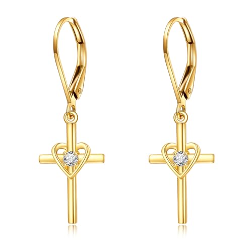 KECHO 14K Solid Gold Heart Cross Earrings Leverback Dangle Drop Earrings jewellery Religious Baptism Gifts for Women