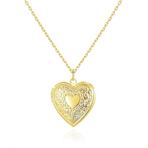 CHENGHONG Locket Necklace 925 Sterling Silver Angel Wings Pendant Gold Heart Shaped Locket Necklace That Holds Picture Memorial Necklaces Memory Jewellery Gifts for Women Girls