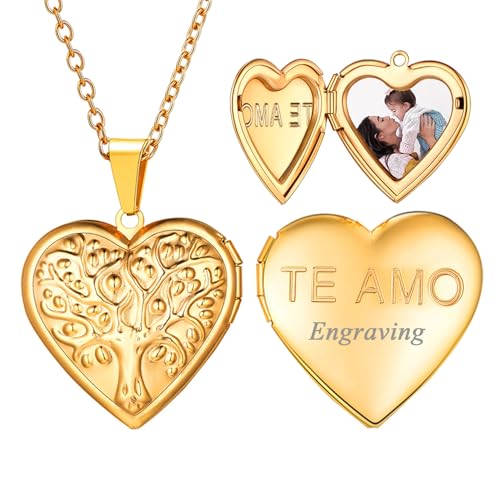 U7 Locket Necklace for Women Gold Plated Heart Pendant with Life Tree Personalized Photo Memorial Necklaces Elegant Jewellery Gifts for Her