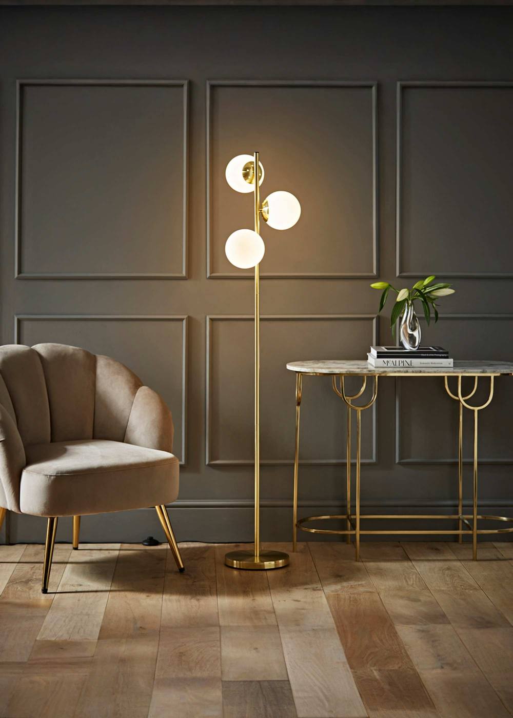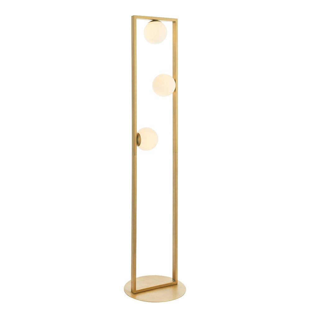 1410mm Brushed Gold Geometric 3 Light Floor Lamp & Glass Opal Sphere Shades