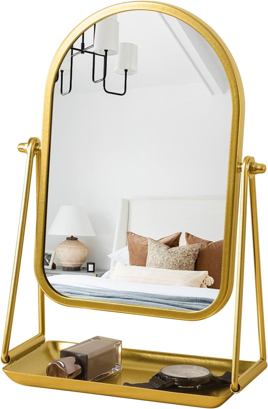 Table Vanity Mirror Gold Oval Desk Makeup Mirror with Tray 360°Adjustable Rota