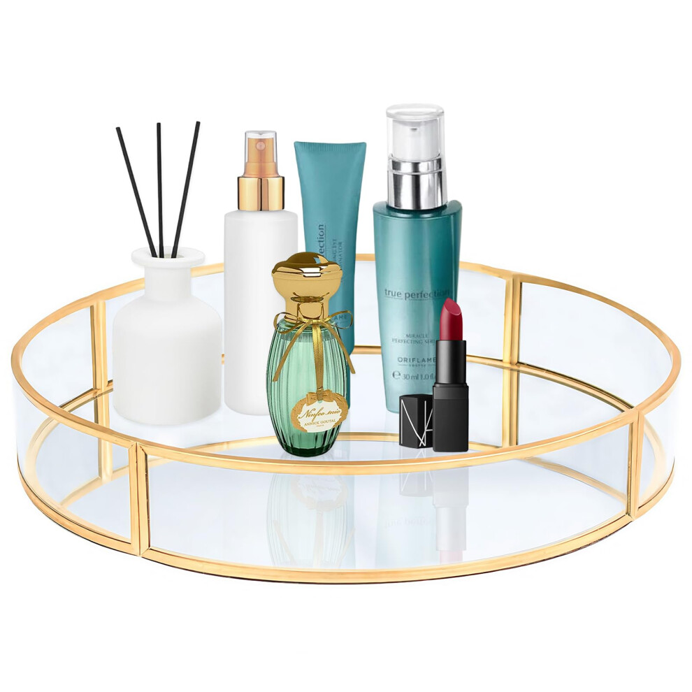 Tray Round, SLHEQING Perfume Organiser, Vintage Decorative Tray, Gold Skincare Makeup Organiser, Mirror Vanity Tray for Dresser, Bedroom, Bathroom