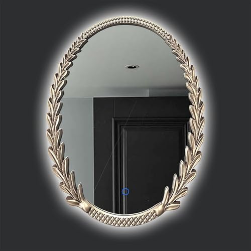 Zhoudong 24×31inch Antique Gold Oval Mirror for Wall, Vintage Ornate Vanity Mirror, 3-Color Backlit Dimmable, European Frame, for Bedroom/Entryway(Silver,3-Color light)
