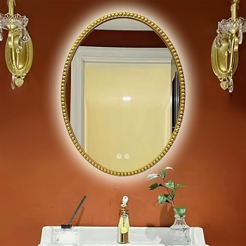 Xxbbyubo Gold Vintage Oval Mirror, LED 3-Color Wall Mirror with PU Frame, Bathroom Smart Anti-Fog, Black French Backlit for Bedroom Living Room Entryway(Gold,50x70cm)