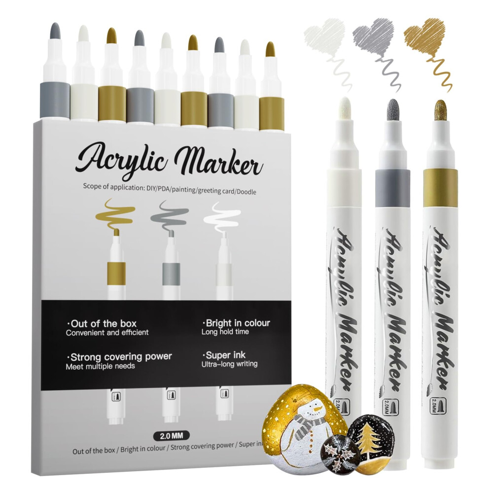 Jnyan Acrylic Paint Pens, 9 Pack 2-3mm Medium Tip Markers, White, Gold, Silver for Art Projects, Drawing, Rock Painting, Wood, Plastic, Metal, Canvas