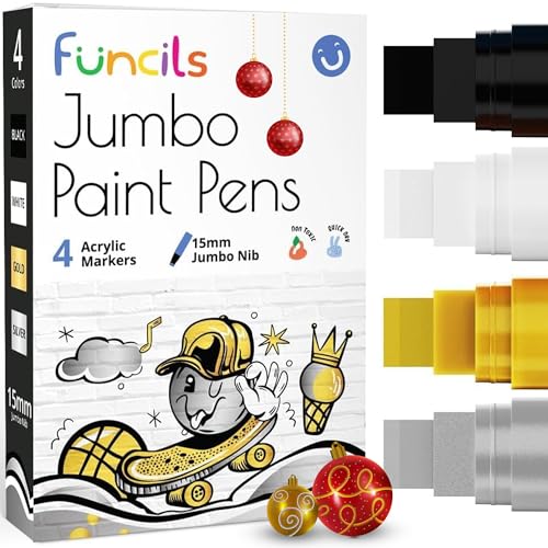Funcils 4 Jumbo Poster Markers (15mm, White, Black, Gold & Silver) | Fat Acrylic Paint Markers for Wood, Glass, Metal, Walls, Fabric - Large Thick Permanent Paint Pens for Signs, Board, Teachers