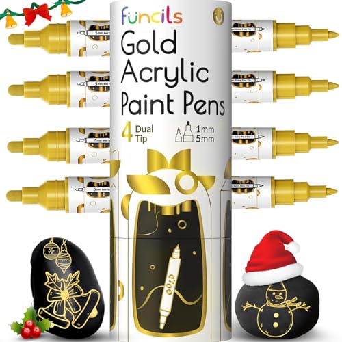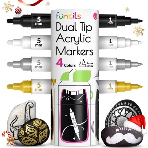 Funcils 4 Dual Tip Acrylic Paint Pens - Fine Tip & Medium, Permanent & Waterproof - Acrylic Paint Markers for Rock Painting, Canvas, Wood, Ceramic, Glass, Fabric, Metal - White, Black, Gold & Silver