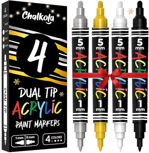 Chalkola 4 Acrylic Paint Pens Dual Tip (White, Black, Gold & Silver) 1mm Fine Tip & 5mm Medium | Permanent Acrylic Paint Markers for Rock Painting, Plastic, Wood, Ceramic, Glass, Fabric, Metal