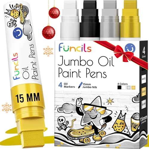 Funcils 15mm Jumbo Oil Based Paint Markers - Oil Paint Pens for Metal, Automotive Tire, Glass, Plastic, Fabric, Wood, Touch up - Waterproof Permanent Metallic Silver, Gold, White, Black Color (4 Pack)