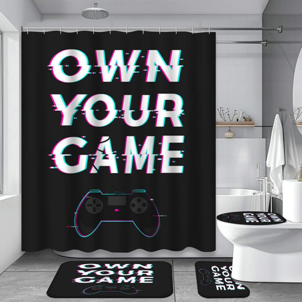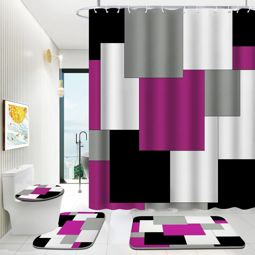 4PCS Bathroom Set with Shower Curtain & Rugs, Gold Purple Design, Includes 12 Hooks, Soft Bath Mat, U-Shaped Floor Mat, Toilet Lid Rug